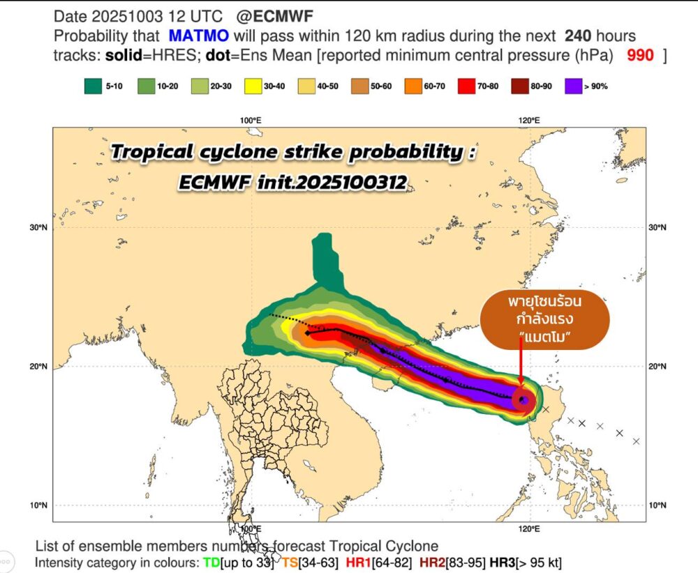 จากประกาศล่าสุดของกรมอุตุฯ ระบุว่า เมื่อวันที่ 3 ตุลาคม 2568 เวลา 16.00 น. พายุโซนร้อนกำลังแรง “แมตโม (Matmo)” มีศูนย์กลางอยู่บริเวณเกาะลูซอน ประเทศฟิลิปปินส์ ก่อนเคลื่อนลงสู่ ทะเลจีนใต้ ด้วยความเร็วลมใกล้ศูนย์กลางราว 95 กิโลเมตรต่อชั่วโมง และกำลังเคลื่อนตัวทางทิศตะวันตกค่อนทางเหนือเล็กน้อย คาดว่าจะ ทวีกำลังเป็นไต้ฝุ่น ขึ้นฝั่งประเทศเวียดนามตอนบนในช่วงวันที่ 5–6 ตุลาคมนี้ แล้วอ่อนกำลังลงเป็นพายุโซนร้อนและพายุดีเปรสชันตามลำดับ