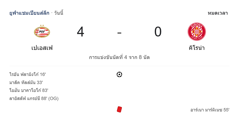 ผลบอลยูฟ่าแชมเปียนส์ลีก 2024 ระหว่าง พีเอสวี ไอนด์โฮเฟ่น 4-0 คิโรน่า