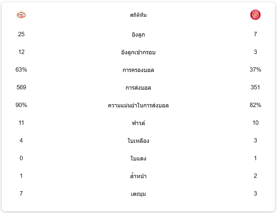 ในเกมนี้ พีเอสวี ไอนด์โฮเฟ่น มีการครองบอลถึง 63% พร้อมการยิงประตูทั้งหมด 25 ครั้งและเข้ากรอบ 12 ครั้ง ขณะที่คิโรน่าครองบอลได้เพียง 37% และยิงเพียง 7 ครั้ง เข้ากรอบแค่ 3 ครั้ง การส่งบอลของพีเอสวีมีความแม่นยำสูงถึง 90% และมีการส่งบอลรวม 569 ครั้ง เทียบกับคิโรน่าที่ส่งบอลได้ 351 ครั้งด้วยความแม่นยำ 82% แสดงให้เห็นถึงความสามารถในการครองเกมของพีเอสวีที่เหนือกว่าอย่างชัดเจน