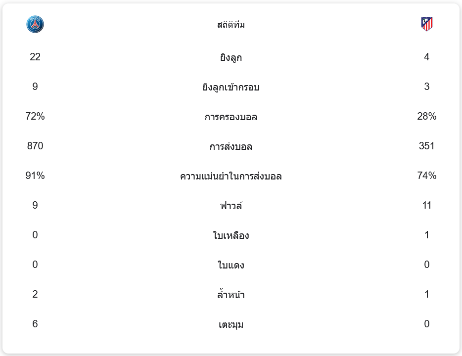 แม้ว่าปารีส แซงต์ แชร์กแมงจะครองบอลได้ถึง 72% และมีการส่งบอลสำเร็จ 870 ครั้ง ด้วยความแม่นยำ 91% แต่ก็ไม่สามารถทำประตูได้มากกว่าทีมเยือน ขณะที่แอตเลติโก้ มาดริดมีโอกาสครองบอลเพียง 28% และส่งบอลสำเร็จ 351 ครั้ง แม้ว่าทีมเยือนจะมีการครองบอลน้อยกว่า แต่ความเฉียบขาดในเกมรับและเกมสวนกลับช่วยให้พวกเขาสามารถทำประตูชี้ขาดได้