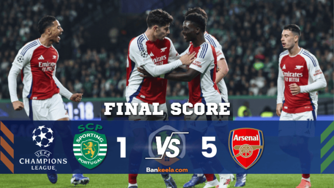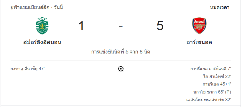 จบเกมที่สนามของสปอร์ติ้ง ลิสบอน ทีมเยือน อาร์เซนอล แสดงความเหนือชั้นในเกมรุกด้วยการทำ 5 ประตู ใส่เจ้าบ้าน สปอร์ติ้ง ลิสบอน แม้เจ้าถิ่นจะพยายามเปิดเกมบุกในช่วงครึ่งหลัง แต่ก็ไม่สามารถหยุดความแข็งแกร่งของทีมเยือนจากอังกฤษได้ นี่คือชัยชนะสำคัญที่ทำให้อาร์เซนอลยึดตำแหน่งจ่าฝูงกลุ่มอย่างมั่นคง