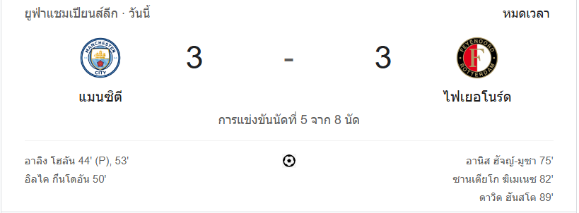 นาทีที่ 95: จบเกม แมนเชสเตอร์ ซิตี้เสมอกับเฟเยนูร์ด 3-3 อย่างดุเดือด