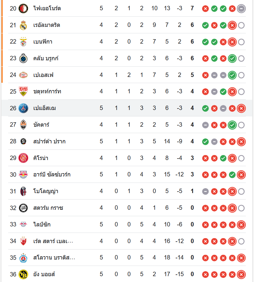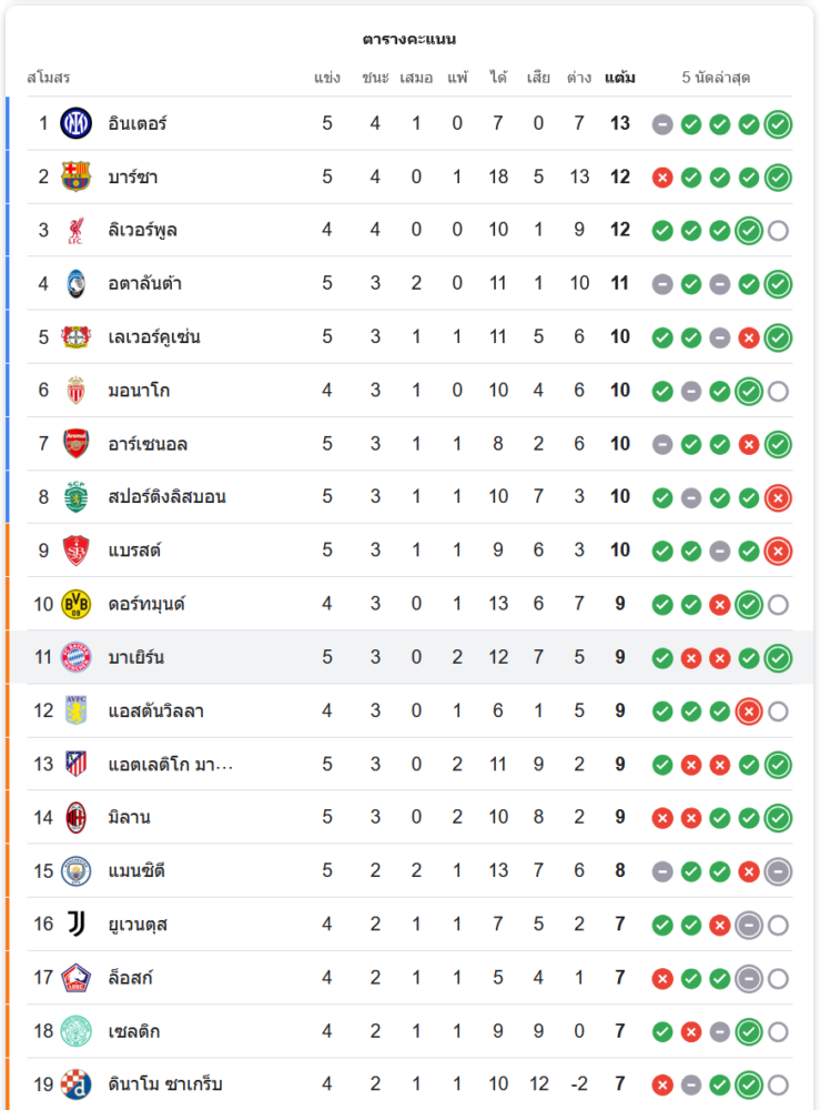 ชัยชนะนัดนี้ส่งผลให้ บาเยิร์น มิวนิค เก็บเพิ่มเป็น 9 คะแนน จาก 5 นัด ขยับขึ้นมาอยู่อันดับที่ 11 ในขณะที่ ปารีส แซงต์ แชร์กแมง รั้งอันดับ 26 ของตารางด้วยเพียง 4 คะแนน สถานการณ์ของ PSG ดูจะยากลำบากขึ้นเรื่อยๆ