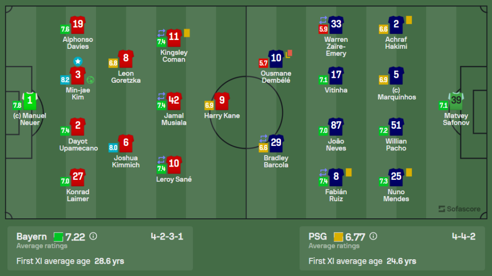 บาเยิร์น มิวนิค ใช้แผน 4-2-3-1 ที่มี แฮร์รี่ เคน เป็นหัวหอกตัวเป้า โดยการประสานงานระหว่างมิดฟิลด์อย่าง โจชัว คิมมิช และ เลรอย ซาเน่ ช่วยเพิ่มความหลากหลายในการบุก แนวรับที่แข็งแกร่งของ คิม มิน-แจ และ อูปาเมกาโน่ ช่วยต้านเกมรุกของ PSG ได้อย่างยอดเยี่ยม ในขณะที่ ปารีส แซงต์ แชร์กแมง ใช้แผน 4-4-2 แต่ขาดความเฉียบคมในเกมรุก แม้มี วิตินญ่า และ เนเวส สร้างเกมจากแดนกลาง แต่ก็ไม่สามารถทะลุทะลวงแนวรับของเจ้าบ้านได้