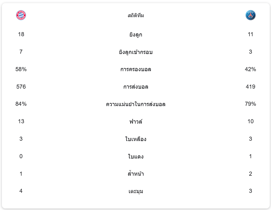 การแข่งขันนี้ บาเยิร์น มิวนิค ครองบอลได้มากถึง 58% พร้อมการผ่านบอลที่แม่นยำถึง 84% ยิงทั้งหมด 18 ครั้ง เข้ากรอบ 7 ครั้ง ในขณะที่ ปารีส แซงต์ แชร์กแมง ครองบอล 42% ยิงทั้งหมด 11 ครั้ง เข้ากรอบเพียง 3 ครั้ง การเสียใบแดงทำให้ทีมเยือนเสียเปรียบและไม่สามารถพลิกเกมได้