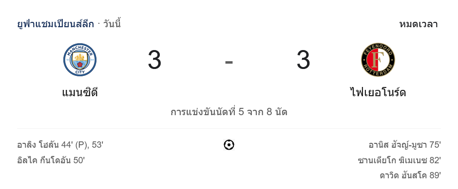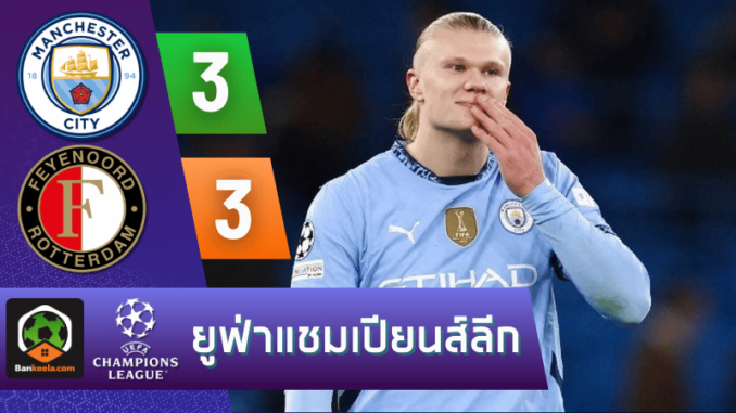 การแข่งขัน ยูฟ่าแชมเปียนส์ลีก 2024 นัดที่ 5 กลุ่มสุดเดือดระหว่าง แมนเชสเตอร์ ซิตี้ และ เฟเยนูร์ด ร็อตเธอร์ดัม จบลงด้วยสกอร์ 3-3 ทำให้เกมนี้เต็มไปด้วยจังหวะดราม่าที่สร้างความตื่นเต้นให้แฟนบอลที่ติดตาม ผลบอลสด ตลอด 90 นาที