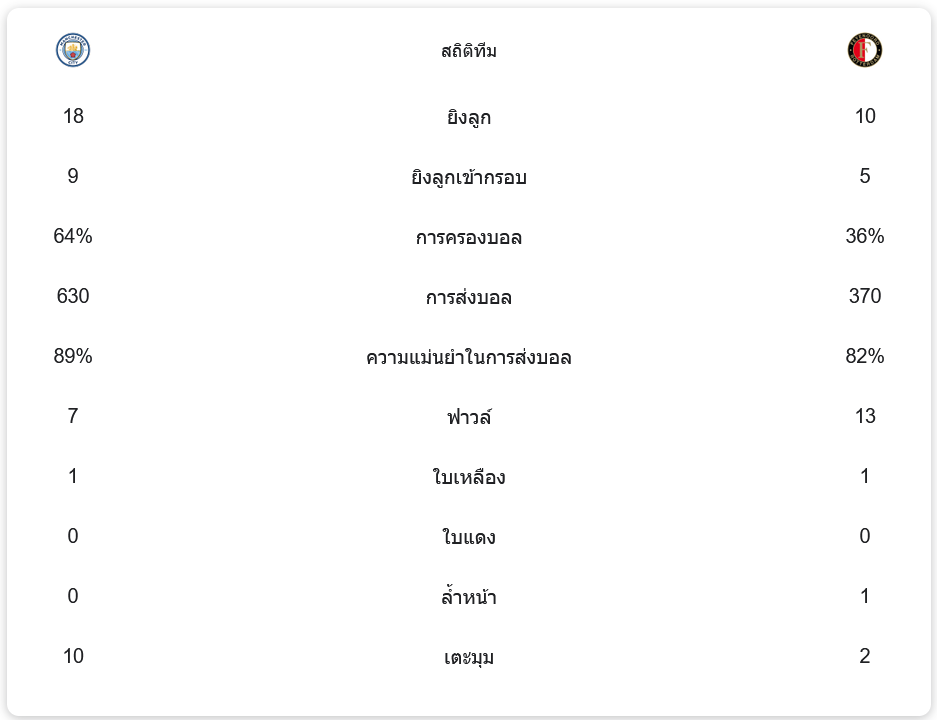 แมนเชสเตอร์ ซิตี้ ครองบอลถึง 64% สร้างโอกาสยิงทั้งหมด 18 ครั้ง โดยเข้ากรอบ 9 ครั้ง ขณะที่ เฟเยนูร์ด ครองบอลเพียง 36% แต่มีโอกาสยิง 10 ครั้ง เข้ากรอบ 5 ครั้ง ความแม่นยำในการผ่านบอลของแมนฯ ซิตี้อยู่ที่ 89% ส่วนเฟเยนูร์ดทำได้ที่ 82%