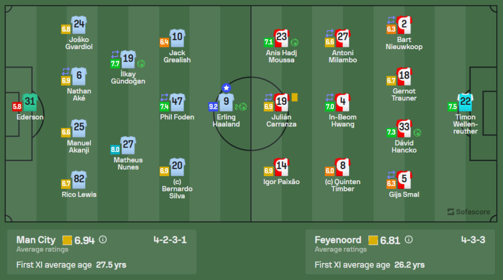 แมนเชสเตอร์ ซิตี้ ใช้แผน 4-2-3-1 โดยมี เออร์ลิ่ง ฮาแลนด์ เป็นตัวจบสกอร์หลัก เกมรุกเน้นการต่อบอลรวดเร็ว และครองบอลสูงถึง 64% พร้อมผ่านบอลแม่นยำ 89% ส่วน เฟเยนูร์ด ร็อตเธอร์ดัม แผน 4-3-3 มีการสวนกลับที่เฉียบคมในครึ่งหลัง ซึ่งทำให้พวกเขาสามารถพลิกสถานการณ์ไล่ตามกลับมาได้อย่างน่าประทับใจ เกมรับของทั้งสองทีมมีความผิดพลาดในช่วงท้ายเกม ทำให้ผลการแข่งขันออกมาเสมอกัน