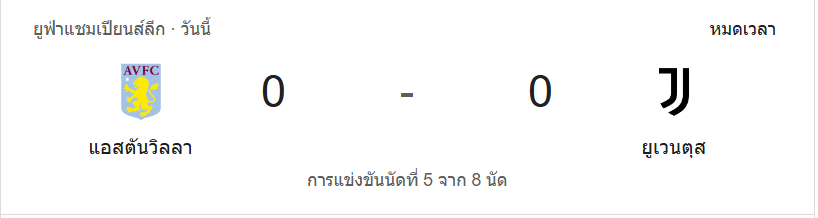เกมสุดเดือดจบลงแบบไร้สกอร์ แต่ยังเต็มไปด้วยจังหวะตื่นเต้นและโอกาสทำประตูมากมาย แอสตัน วิลล่า และ ยูเวนตุส ต่างแสดงให้เห็นถึงเกมรับที่แข็งแกร่งและการวางแผนที่รัดกุม แม้ไม่มีผู้ชนะในวันนี้ แต่ทั้งสองทีมยังมีโอกาสในนัดต่อไป แฟนบอลอย่าลืมติดตามความเข้มข้นในรอบต่อไป!