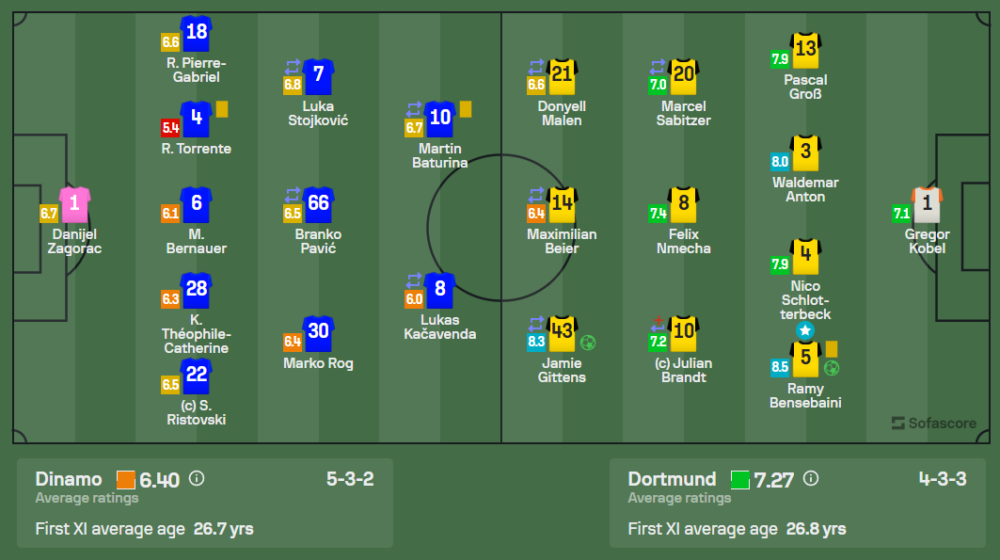 ดอร์ทมุนด์เล่นในระบบ 4-3-3 ซึ่งเน้นการครองบอลและเกมรุกที่เร็วและแม่นยำ วิเคราะห์บอลชี้ให้เห็นว่า ทีมเยือนมีความได้เปรียบทั้งในแง่ของการเคลื่อนที่และการจ่ายบอล ขณะที่ดินาโม ซาเกร็บใช้ระบบ 5-3-2 เพื่อเน้นเกมรับ แต่ยังขาดความแม่นยำในเกมสวนกลับ ทำให้ไม่สามารถสร้างโอกาสที่ชัดเจนได้