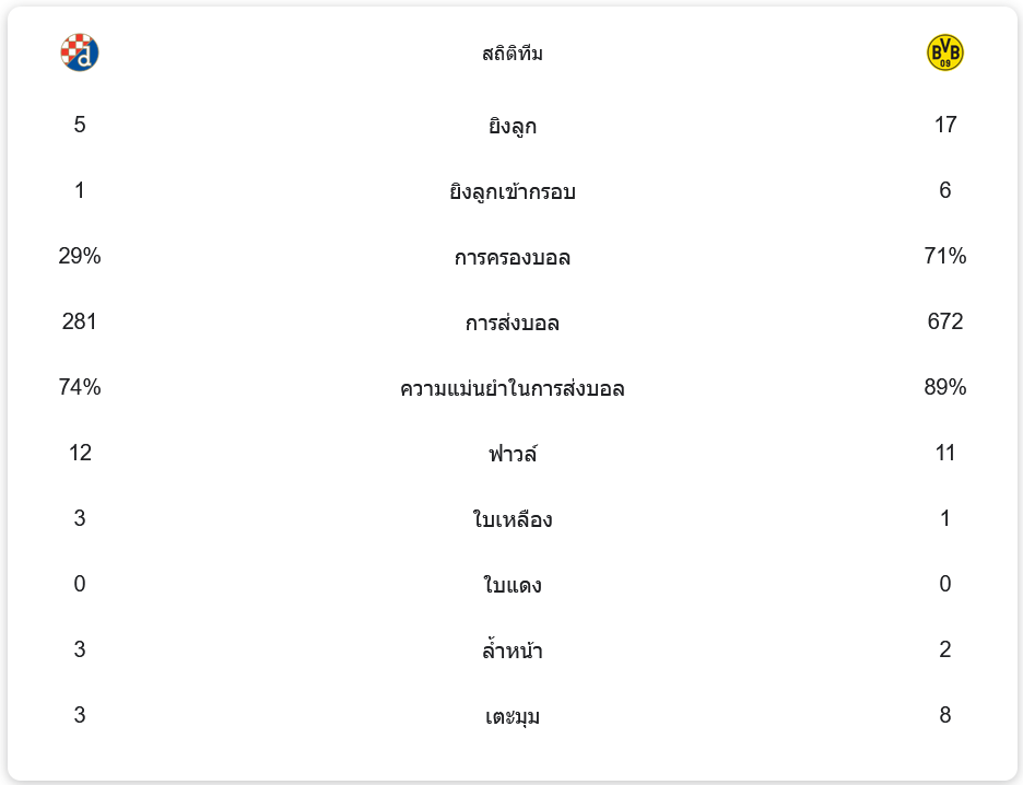 ดอร์ทมุนด์ครองบอลถึง 71% พร้อมมีโอกาสยิงมากถึง 17 ครั้ง เข้ากรอบ 6 ครั้ง ในขณะที่ซาเกร็บครองบอลเพียง 29% และยิงเข้ากรอบเพียง 1 ครั้ง ความแม่นยำในการจ่ายบอลของดอร์ทมุนด์สูงถึง 89% เทียบกับ 74% ของซาเกร็บ