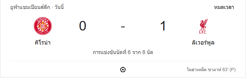นาทีที่ 46: ทดเวลาบาดเจ็บ 1 นาที ลิเวอร์พูลพยายามบุกอีกครั้ง แต่แนวรับคิโรน่ายังเหนียวแน่น