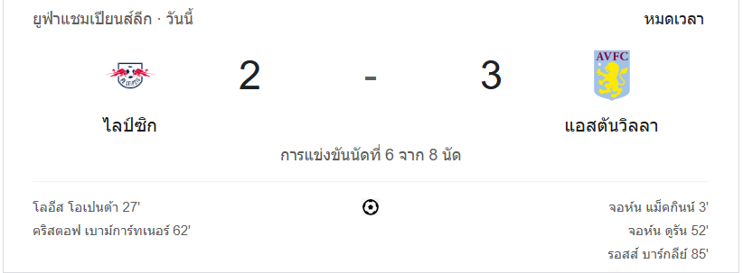 นาทีที่ 94: จบเกม แอสตัน วิลล่าเอาชนะไลป์ซิก 3-2