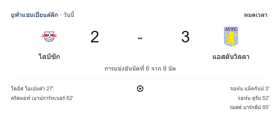 บ้านผลบอล สรุปผล แอร์เบ ไลป์ซิก พ่ายคารัง แอสตัน วิลล่า 2-3 ในศึกยูฟ่าแชมเปียนส์ลีก 2024 สุดมันส์
