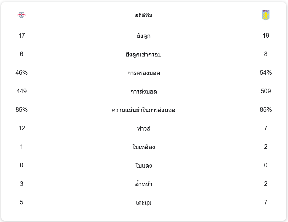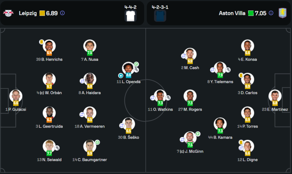 เกมนี้ แอสตัน วิลล่า ครองบอลได้มากกว่า 54% และมีโอกาสยิงทั้งหมด 19 ครั้ง เทียบกับ แอร์เบ ไลป์ซิก ที่ยิงไป 17 ครั้ง ความแม่นยำในการจบสกอร์และความเด็ดขาดในจังหวะสำคัญกลายเป็นจุดต่างของผลการแข่งขัน โดย โลอิส โอเปนด้า โดดเด่นในเกมรุกของไลป์ซิก ส่วน รอสส์ บาร์คลี่ย์ เป็นฮีโร่ของวิลล่า