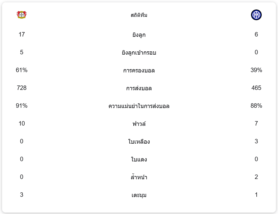 เกมนี้ เลเวอร์คูเซิน ครองบอลได้ถึง 61% และมีโอกาสยิงทั้งหมด 17 ครั้ง โดยเข้ากรอบ 5 ครั้ง ขณะที่ อินเตอร์ มิลาน มีโอกาสยิงเพียง 6 ครั้งและไม่สามารถยิงเข้ากรอบได้เลย ความแม่นยำในการส่งบอลของเลเวอร์คูเซินอยู่ที่ 91% ซึ่งเป็นตัวแปรสำคัญที่ช่วยให้ทีมครองเกมได้เหนือกว่า