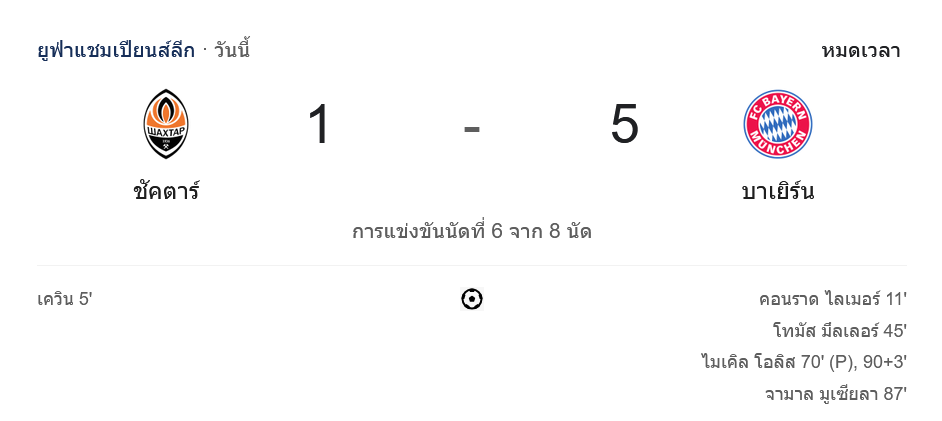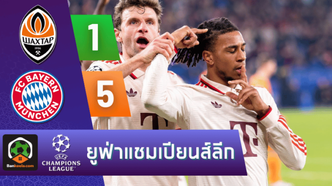 การแข่งขันฟุตบอลยูฟ่าแชมเปียนส์ลีก 2024 รอบแบ่งกลุ่ม เมื่อคืนนี้เป็นการพบกันระหว่าง เอฟซี ชัคตาร์ โดเน็ตส์ก และ บาเยิร์น มิวนิค ผลสกอร์จบลงที่ 5-1 โดยทีมเยือนจากเยอรมันโชว์ฟอร์มเหนือชั้น พร้อมคว้า 3 แต้มกลับบ้านได้อย่างเด็ดขาด