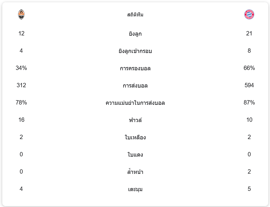 บาเยิร์นครองบอลได้ถึง 66% มีโอกาสยิง 21 ครั้ง ขณะที่ชัคตาร์มีโอกาสยิง 12 ครั้ง บาเยิร์นยังแสดงความแม่นยำในการผ่านบอลถึง 87% เทียบกับ 78% ของชัคตาร์