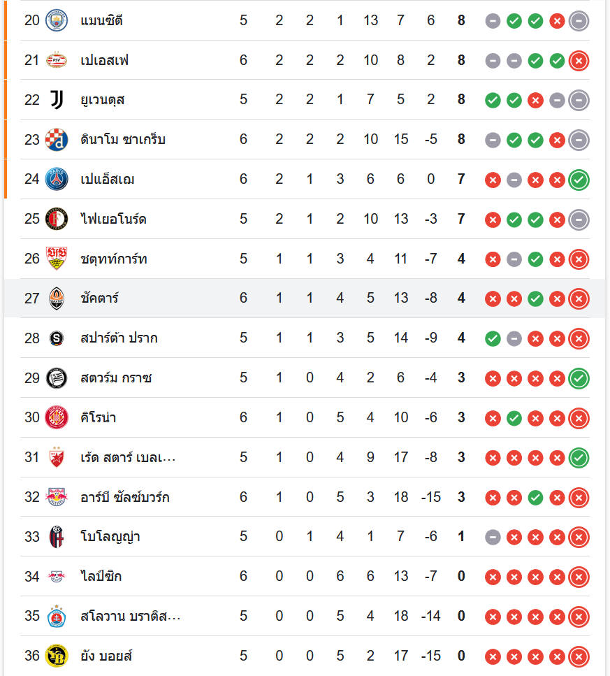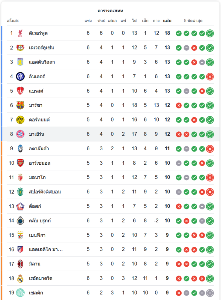 บาเยิร์นเก็บเพิ่มเป็น 12 คะแนน อยู่อันดับ 8 ส่วนชัคตาร์ยังคงมี 4 คะแนน อยู่ในอันดับ 27