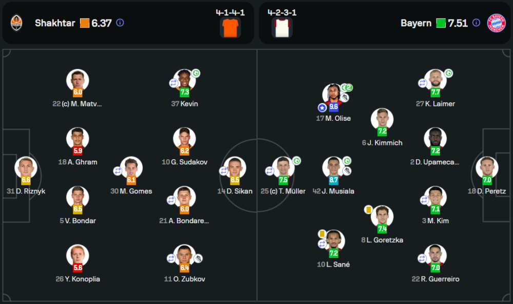 บาเยิร์นมาในแผน 4-2-3-1 ที่เน้นเกมรุกอย่างชัดเจน โดยมูเซียลาและโอลิเซโชว์ฟอร์มโดดเด่นในการสร้างโอกาสและทำเกม ส่วนชัคตาร์ที่มาในแผน 4-1-4-1 เน้นการรับลึกและการโต้กลับเร็ว แต่ไม่สามารถต้านทานเกมเพรสซิ่งที่มีคุณภาพของบาเยิร์นได้