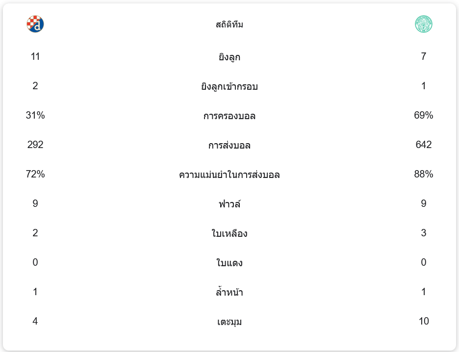 - ดินาโม ซาเกร็บ: ยิง 11 ครั้ง, ครองบอล 31%, ส่งบอล 292 ครั้ง