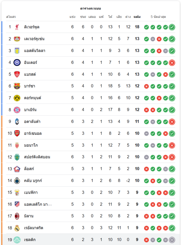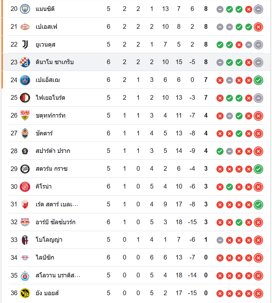 ดินาโม ซาเกร็บ ขยับขึ้นมาอยู่อันดับ 23 มี 8 คะแนน ส่วน เซลติก อยู่ที่อันดับ 19 มี 9 คะแนน