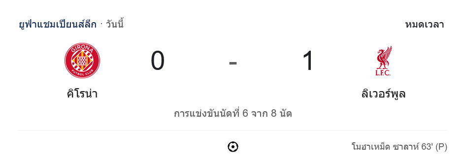 การแข่งขันฟุตบอล ยูฟ่าแชมเปียนส์ลีก 2024 นัดที่ 6 ระหว่าง คิโรน่า และ ลิเวอร์พูล จบลงด้วยผลบอลสดที่แฟนบอลลุ้นระทึกเมื่อ “หงส์แดง” ลิเวอร์พูลเฉือนเอาชนะคิโรน่าไปได้ 1-0 จากจุดโทษของ โมฮาเหม็ด ซาลาห์ ในนาทีที่ 63 การแข่งขันนี้สะท้อนฟอร์มการเล่นที่แกร่งของลิเวอร์พูลและการจัดการเกมที่ยอดเยี่ยมของผู้รักษาประตู อลิสซอน เบ็คเกอร์ ที่ช่วยทีมรักษาคลีนชีตได้สำเร็จ