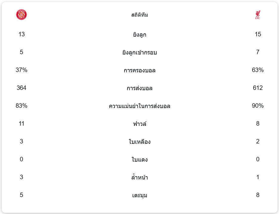 ลิเวอร์พูลครองบอลได้มากถึง 63% เมื่อเทียบกับคิโรน่าที่ครองบอล 37% ทั้งสองทีมมีโอกาสยิงรวม 28 ครั้ง (ลิเวอร์พูล 15, คิโรน่า 13) และลิเวอร์พูลมีความแม่นยำในการส่งบอลถึง 90% สะท้อนถึงการคุมจังหวะเกมที่เหนือกว่า