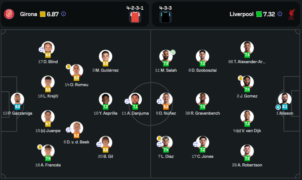 คิโรน่า ใช้แผน 4-2-3-1 เน้นการครองบอลในแดนกลางเพื่อควบคุมจังหวะเกม แต่จุดอ่อนคือเกมรับที่เปิดช่องให้ลิเวอร์พูลใช้ความเร็วโจมตี ขณะที่ ลิเวอร์พูล ในระบบ 4-3-3 เด่นเรื่องการเปลี่ยนจังหวะรุกเร็ว โดยเฉพาะการสร้างโอกาสจากปีกซ้ายผ่านหลุยส์ ดิอาซและการตัดสินใจในกรอบเขตโทษของซาลาห์ ซึ่งกลายเป็นปัจจัยชี้ขาด