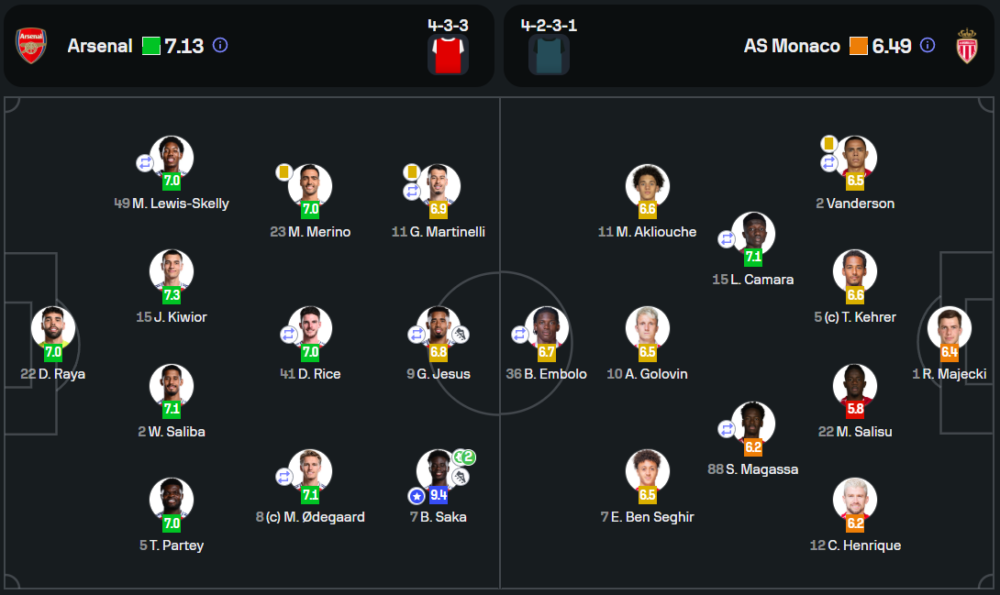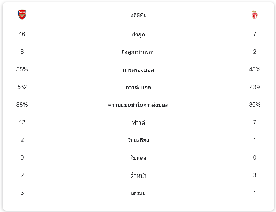 - ความแม่นยำในการส่งบอล: อาร์เซนอล 88%, โมนาโก 85%