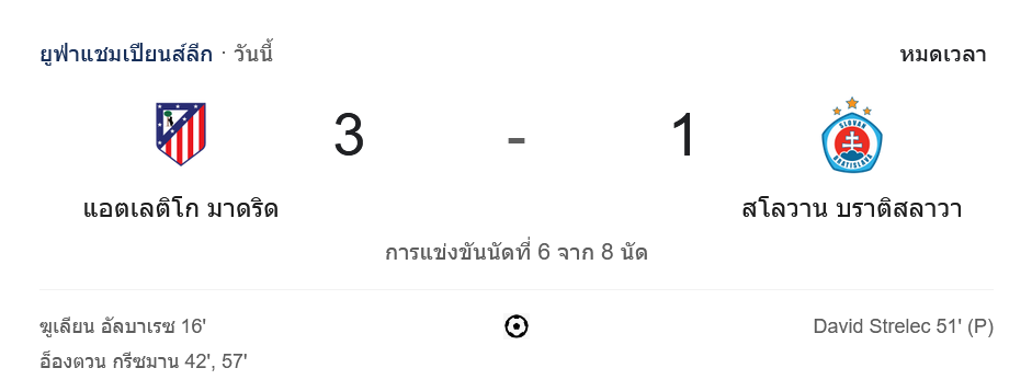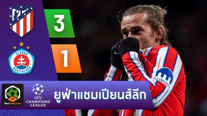 ผลบอลสด จากค่ำคืนที่ร้อนระอุในสนาม แอตเลติโก้ มาดริด เปิดบ้านโชว์ฟอร์มยอดเยี่ยม บดเอาชนะ สโลวาน บราติสลาวา ไปด้วยสกอร์ 3-1 เก็บสามแต้มสำคัญในรอบแบ่งกลุ่ม ยูฟ่าแชมเปียนส์ลีก 2024 โดย อองตวน กรีซมันน์ โชว์ฟอร์มเด่น คว้า Player of the Match ด้วยคะแนนสูงถึง 8.9
