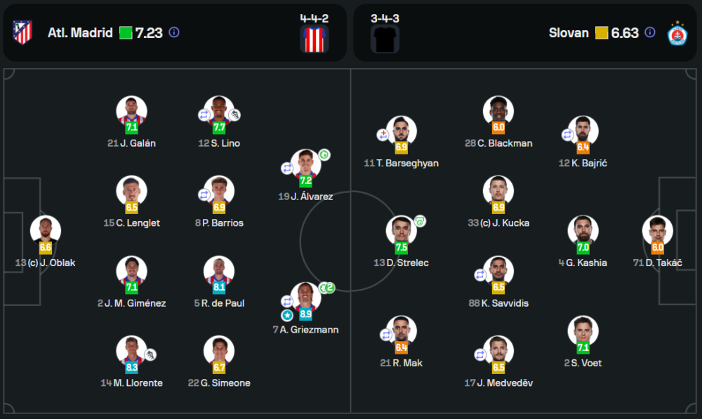 สโลวาน บราติสลาวา มีจังหวะฮึดในนาทีที่ 51 เมื่อ เดวิด สเตรเลค ยิงจุดโทษให้ทีมไล่ตามมา 2-1 แต่เกมนี้เป็นของแอตเลติโก้ นาทีที่ 57 อองตวน กรีซมันน์ กลับมาแผลงฤทธิ์อีกครั้ง ยิงปิดกล่องจากการแอสซิสต์ของ โกเก้ จบเกมด้วยชัยชนะ 3-1 สำหรับเจ้าบ้าน