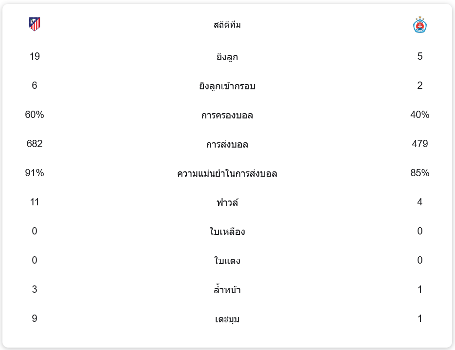 วิเคราะห์บอล นัดนี้ แอตเลติโก้ มาดริด ใช้ระบบ 4-4-2 ที่เน้นการครองบอลและการโจมตีริมเส้น ทำให้เกมรุกไหลลื่น ขณะที่ สโลวาน บราติสลาวา ใช้แผน 3-4-3 หวังสวนกลับด้วยผู้เล่นแดนหน้าสามคน แต่ความแม่นยำในการจ่ายบอลยังห่างชั้นกันชัดเจน แอตเลติโก้ ครองบอลได้ถึง 60% และสร้างโอกาสยิงได้ถึง 19 ครั้ง เทียบกับทีมเยือนที่ยิงได้เพียง 5 ครั้ง
