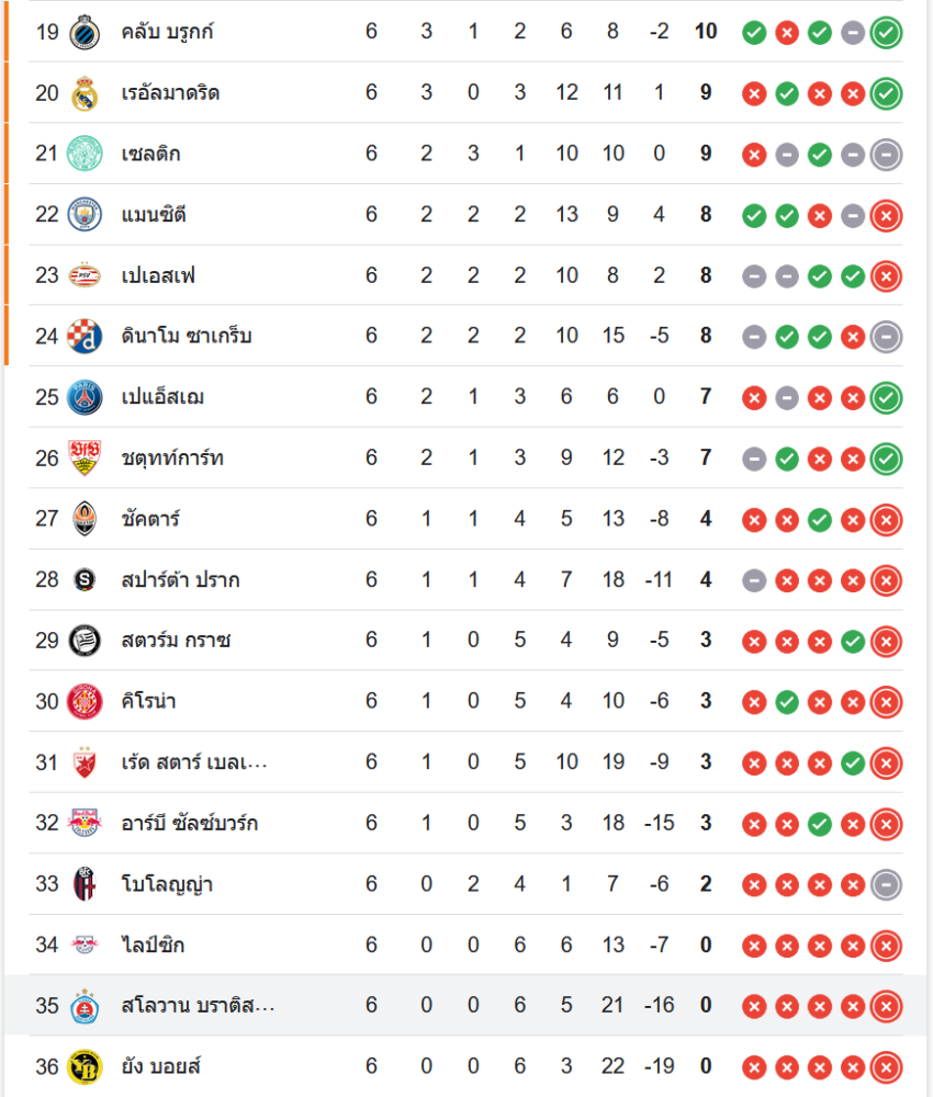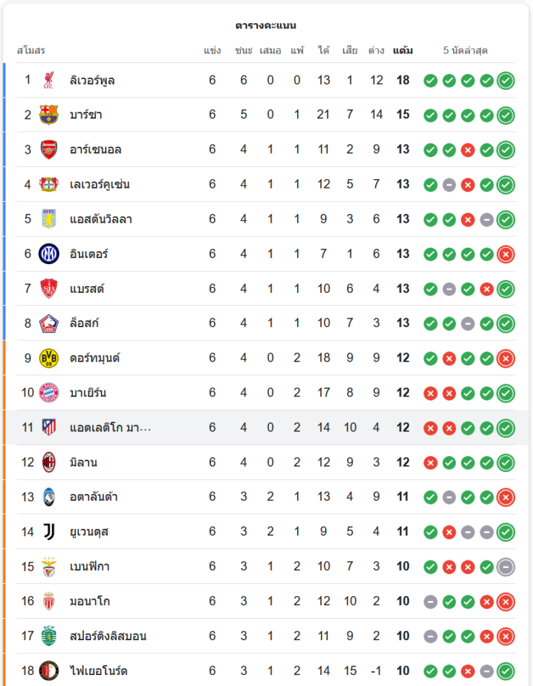 แอตเลติโก้ มาดริด เก็บ 12 แต้มจาก 6 นัด รั้งอันดับ 11 ส่วน สโลวาน บราติสลาวา ตกไปอยู่ในอันดับ 35 หลังยังไม่มีแต้มในตาราง