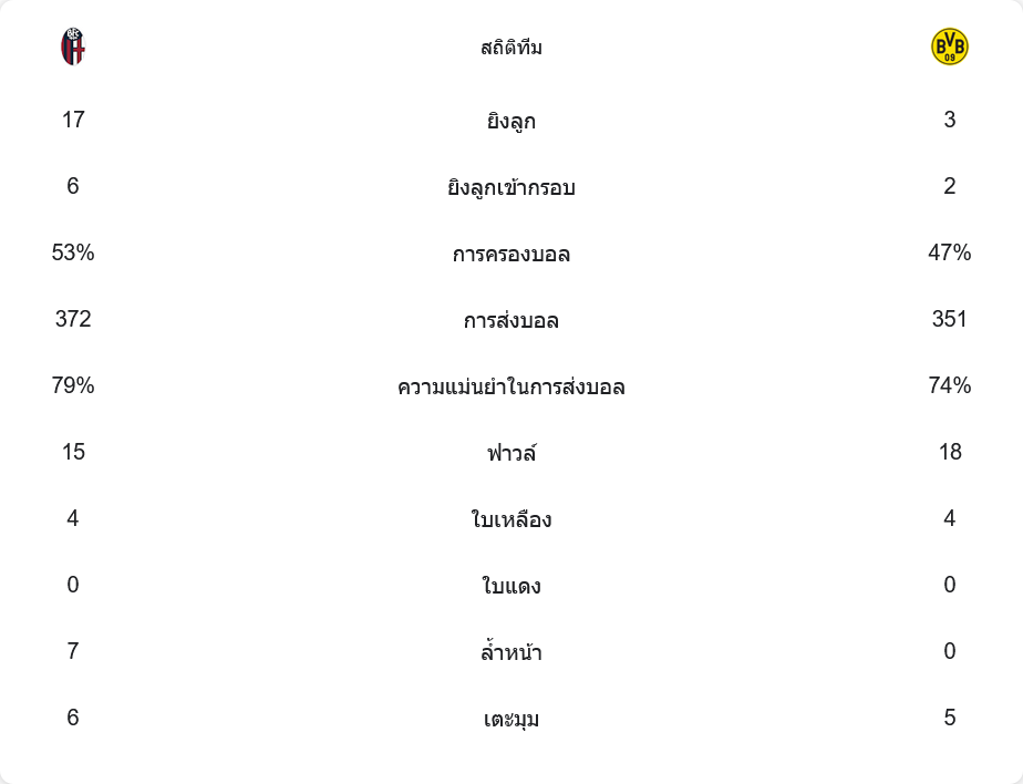 โบโลญญ่า มีโอกาสยิง 17 ครั้ง ตรงกรอบ 6 ครั้ง ขณะที่ ดอร์ทมุนด์ ยิงเพียง 3 ครั้ง ตรงกรอบ 2 ครั้ง