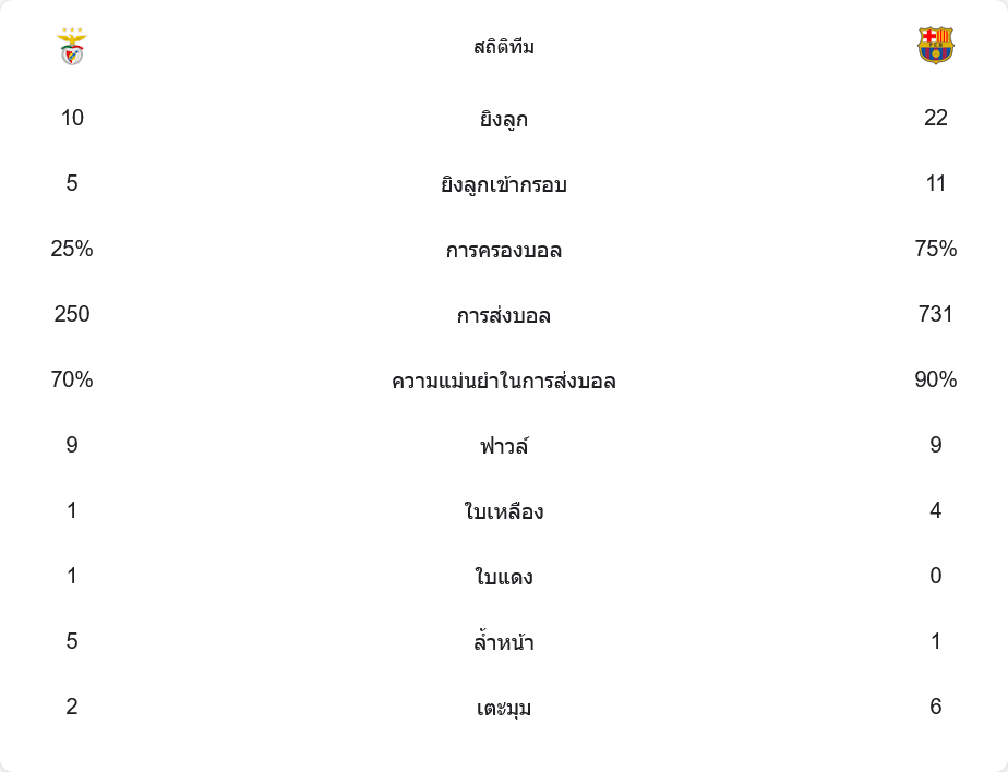 บาร์ซ่ายิงทั้งหมด 22 ครั้ง เข้ากรอบ 11 ครั้ง ส่วนเบนฟิก้ายิง 10 ครั้ง เข้ากรอบ 5 ครั้ง