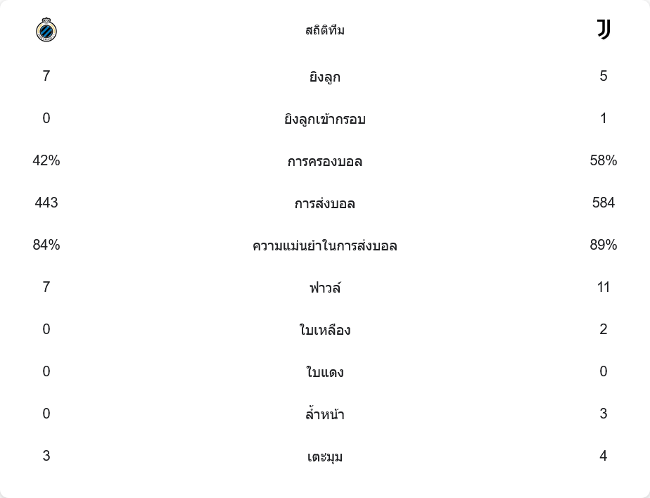 ยูเวนตุสเป็นฝ่ายครองบอลมากกว่าที่ 58% เทียบกับคลับบรูซที่ 42% แต่คลับบรูซกลับเป็นฝ่ายที่มีโอกาสยิงมากกว่าที่ 7 ครั้ง ขณะที่ยูเวนตุสยิงเพียง 5 ครั้ง เท่านั้น และยิงตรงกรอบแค่ 1 ครั้ง คลับบรูซแม้จะไม่มีลูกยิงเข้ากรอบเลย แต่มีจังหวะลุ้นหลายครั้ง นอกจากนี้ยูเวนตุสยังทำฟาวล์มากถึง 11 ครั้ง และโดนใบเหลือง 2 ใบ ส่วนคลับบรูซเล่นได้สะอาดกว่าด้วยการฟาวล์ 7 ครั้ง และไม่มีใบเหลืองหรือใบแดงเลย