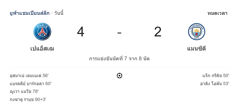 จาก : ผลบอลสด ยูฟ่าแชมเปียนส์ลีก 2024 ระหว่าง ปารีส แซงต์ แชร์กแมง 4-2 แมนเชสเตอร์ ซิตี้ วันนี้ 23/1/68 – บ้านกีฬา