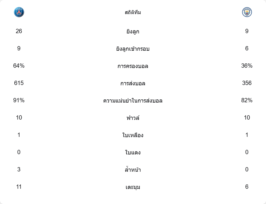 จากสถิติที่ออกมาเห็นได้ชัดว่า เปแอสเช คุมเกมได้เกือบทั้งหมด มีเปอร์เซ็นต์ครองบอลสูงกว่า สร้างโอกาสได้มากกว่า และมีเกมรุกที่เฉียบคมกว่า ขณะที่ แมนฯ ซิตี้ แม้จะออกนำก่อน 2-0 แต่การเล่นเกมรับที่หลวมและเสียสมาธิในช่วงท้ายเกม ทำให้พวกเขาโดนพลิกกลับมาแพ้ในที่สุด