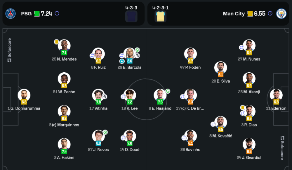 เปแอสเชเลือกใช้แผน 4-3-3 เน้นการบุกจากริมเส้น โดยมี บาร์โกลา และ เดมเบเล่ เป็นตัวทะลุทะลวง ขณะที่ วิตินญ่า คุมจังหวะกลางสนาม แมนฯ ซิตี้ วางหมาก 4-2-3-1 ใช้ เดอ บรอยน์ เป็นตัวปั้นเกมหลัง ฮาแลนด์ แต่จุดอ่อนอยู่ที่แนวรับที่เสียสมาธิในช่วงท้ายเกม