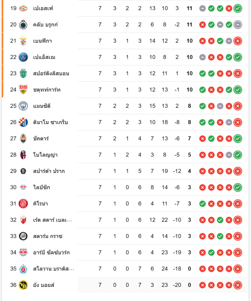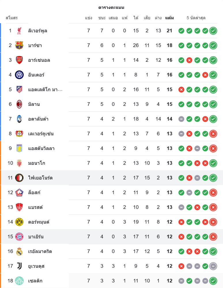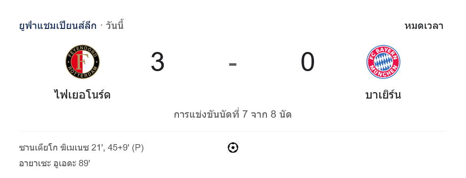 เฟเยนูร์ด ขยับขึ้นไปมี 13 คะแนน อยู่ในกลุ่มทีมลุ้นเข้ารอบ ส่วน บาเยิร์น ยังคงมี 12 คะแนน และสถานการณ์เริ่มไม่แน่นอน