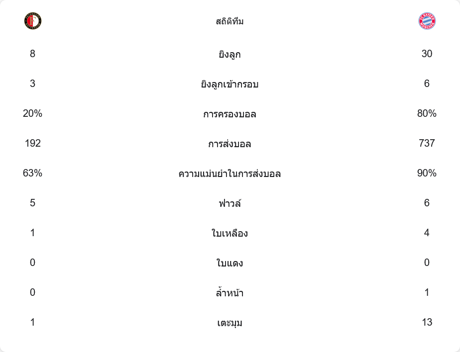 เฟเยนูร์ด ยิง 8 ครั้ง เข้ากรอบ 3 ครั้ง และทำได้ 3 ประตู แสดงถึงความเฉียบคม ขณะที่ บาเยิร์น ยิงถึง 30 ครั้ง แต่เข้ากรอบเพียง 6 ครั้ง