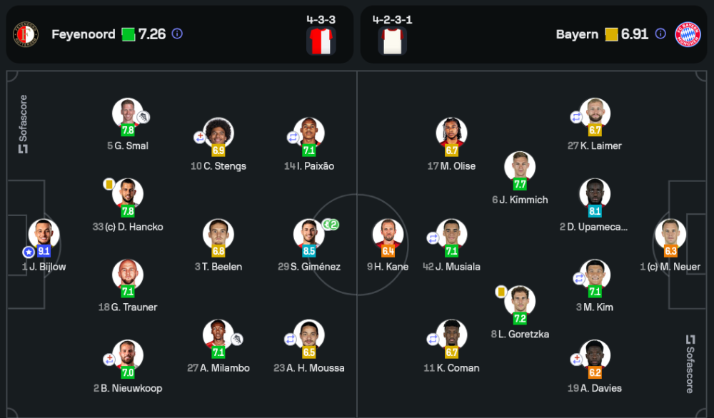 บาเยิร์นใช้แผน 4-2-3-1 เน้นการครองบอลและโจมตีจากริมเส้น แต่ขาดประสิทธิภาพในการจบสกอร์ ส่วน เฟเยนูร์ด วางหมาก 4-3-3 ใช้เกมสวนกลับที่รวดเร็วและเฉียบคม ทำให้พวกเขาสามารถลงโทษแนวรับของบาเยิร์นได้
