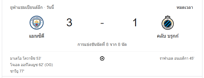 เกมนี้ คลับ บรูซ เริ่มต้นได้ดีขึ้นนำก่อน แต่สุดท้ายก็ไม่สามารถต้านทานพลังเกมรุกของ แมนเชสเตอร์ ซิตี้ ได้ มาเตโอ โควาชิช, โจเอล ออร์โดเนซ (OG) และ ซาวินโญ่ ช่วยกันทำประตูให้เจ้าบ้านพลิกคว้าชัย เก็บสามแต้มสำคัญในถ้วยยุโรป!