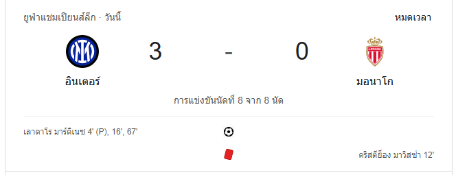 นาทีที่ 49: ผู้ตัดสินเป่านกหวีดจบครึ่งแรก อินเตอร์ มิลานนำโมนาโก 2-0