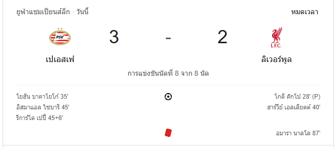PSV ไอนด์โฮเฟ่น โชว์ฟอร์มสุดยอดด้วยการพลิกแซงชนะ ลิเวอร์พูล 3-2 ในเกมที่เต็มไปด้วย ความดุเดือด และ เหตุการณ์สำคัญมากมาย แม้ว่าลิเวอร์พูลจะออกนำก่อน แต่ PSV ก็คัมแบ็กได้อย่างแข็งแกร่ง พร้อมคว้าสามแต้มสำคัญในศึก ยูฟ่าแชมเปียนส์ลีก
