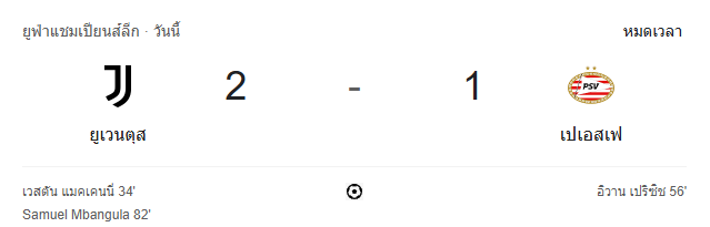 • นาทีที่ 95 กรรมการเป่านกหวีดจบเกม ยูเวนตุสเอาชนะพีเอสวี ไอนด์โฮเฟ่น 2-1