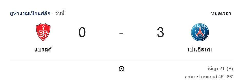 แม้แบรสต์จะพยายามเปิดเกมรุกสู้ แต่การครองบอลที่เหนือกว่าของเปแอสเชทำให้เจ้าถิ่นหาจังหวะยิงได้ยาก และก่อนหมดครึ่งแรก “อุสมาน เดมเบเล่” มายิงประตูที่สองในช่วงทดเวลาบาดเจ็บ นาทีที่ 45 จากการแอสซิสต์ของ “อัชราฟ ฮาคิมี่” ส่งให้เปแอสเชจบครึ่งแรกนำ 2-0