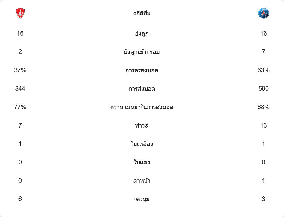 เปแอสเชแสดงให้เห็นถึงประสิทธิภาพทั้งเกมรุกและการครองบอล พวกเขามีเปอร์เซ็นต์ครองบอล 63% เทียบกับแบรสต์ที่มีเพียง 37% แม้ว่าทั้งสองทีมจะมีโอกาสยิง 16 ครั้งเท่ากัน แต่เปแอสเชยิงตรงกรอบ 7 ครั้ง ขณะที่แบรสต์ยิงตรงกรอบเพียง 2 ครั้ง สะท้อนถึงคุณภาพในการเข้าทำของทีมเยือน