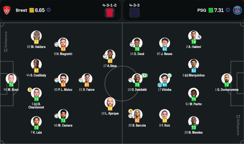 เกมนี้แสดงให้เห็นถึงความต่างชั้นอย่างชัดเจน “ปารีส แซงต์ แชร์กแมง” คุมเกมได้ตั้งแต่นาทีแรก โดยใช้ระบบ 4-3-3 ที่ยืดหยุ่นในการครองบอลถึง 63% การเชื่อมเกมระหว่าง วิตินญ่า – เนเวส – ฮาคิมี่ เป็นกุญแจสำคัญที่ทำให้พวกเขาทำลายแนวรับของแบรสต์ได้